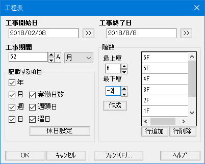 実働日数などを考慮し、工事開始から終了までの工程表を作成します。 ■ ダイアログ画面